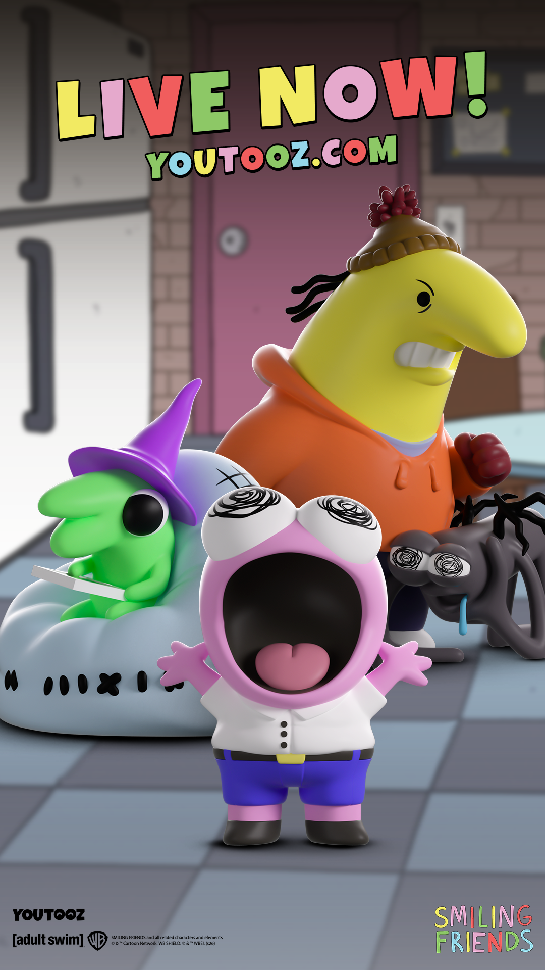 This segment again focuses on a medium shot of the stylized Skips Youtooz figure, seated on the small dark gray stool and continuing his dumbbell workout. The figure, with its glossy, smooth white fur and powerfully muscular build, performs another slow 360-degree rotation. This action provides a comprehensive view of its intricate design from all angles. Skips' stern facial expression and intense focus remain evident as he holds the dark gray dumbbells. The background maintains its soft-focus, brightly lit park setting, featuring lush green grass, various trees, and the distant green house under a clear, light blue sky. The "REGULAR SHOW" title is positioned at the top, and the company logos are at the bottom. The strong and focused atmosphere is consistently conveyed through the dominant white, purple, and green color scheme.